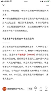 台湾公司+谷歌meta眼镜+英特尔+CPO+和大股东日月光合作先进封装 环旭电子为谷歌眼镜RF模组供应商----------据谷歌眼镜探索者版拆解报告显示,其RF模组芯片型号为WM-BM-BM-04-a,标有USI(环旭电子国际标示),这意味着环旭电子(601231)成功成为谷歌眼镜的供应商。目前微型化是现代工业产品一大趋势,尤其在电子行业,微型化需求持续增加。环旭电子在PCB微型化封装,微小化产品制程等方面优势突出,公司生产的无线通讯SiP模组可以集成WIFI、FM、BT芯片,能够满足可穿戴设