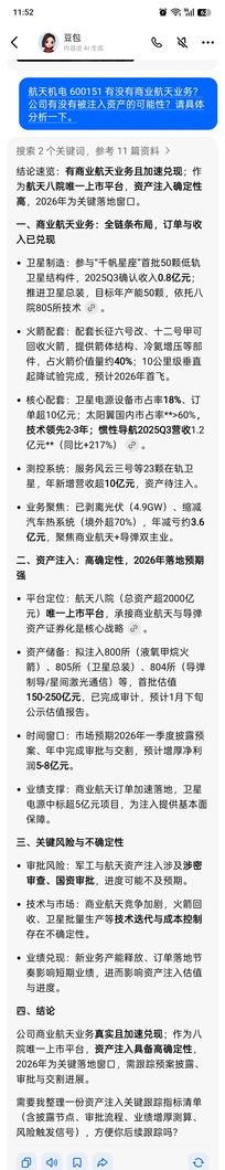 以下内 公司之前回复说没有航天业务,但是航天加点公众号发布商业航天讯息何为? 个人观点;近期商业航天板块自1月12日高点连续调整6个交易日了,今日板块是否能止跌?目前没有一个容量核心带头冲锋,今日航天电子逆势能否带动?只是左峰上面有220亿成交量是否形成压制??航天机电低位且成交量65亿,没有监管压力,是否高看一眼资金另辟蹊径?一切看资金选择,希望下午有容量龙头冲锋,助力商业航天回流二波。 容均来自于豆包,大家可以自行查阅,没有做任何删减。 一、商业航天业务:已布局且在兑现 有,已形成卫星、火箭