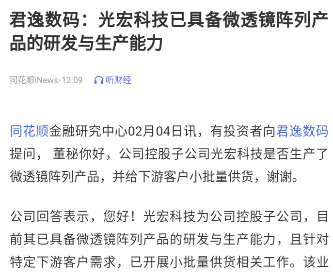 君逸数码:微透镜阵列已开展小批量供货 对标OCS炬光科技