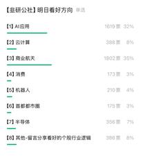投票数据: 【1】AI应用: 1)字节豆包:字节跳动旗下火山引擎正式官宣成为2026年中央广播电视总台春晚独家AI云合作伙伴。 2)阿里千问:2026年2月6日,千问APP将投入30亿启动“春节请客计划”,以免单形式请全国人民在春节期间吃喝玩乐。 【2】云计算: 2026年1月27日消息,谷歌云官宣涨价,将于2026年5月1日对GoogleCloud、CDN Interconnect 、Peering 和AI与计算基础设施服务涨价,其中北美地区最大涨幅100%。 【3】商业航天: 1)2026年