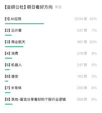 投票数据: 【1】AI应用: 1)腾讯元宝:2026年2月1日,腾讯AI应用元宝正式上线总规模约10亿元的春节现金红包活动,app store免费榜排名提升至第一。 2)字节豆包:字节跳动旗下火山引擎正式官宣成为2026年中央广播电视总台春晚独家AI云合作伙伴。 3)阿里千问:2026年2月2日,千问APP宣布投入30亿启动“春节请客计划”,以免单形式请全国人民在春节期间吃喝玩乐。 【2】云计算: 2026年1月27日消息,谷歌云官宣涨价,将于2026年5月1日对GoogleCloud、CDN